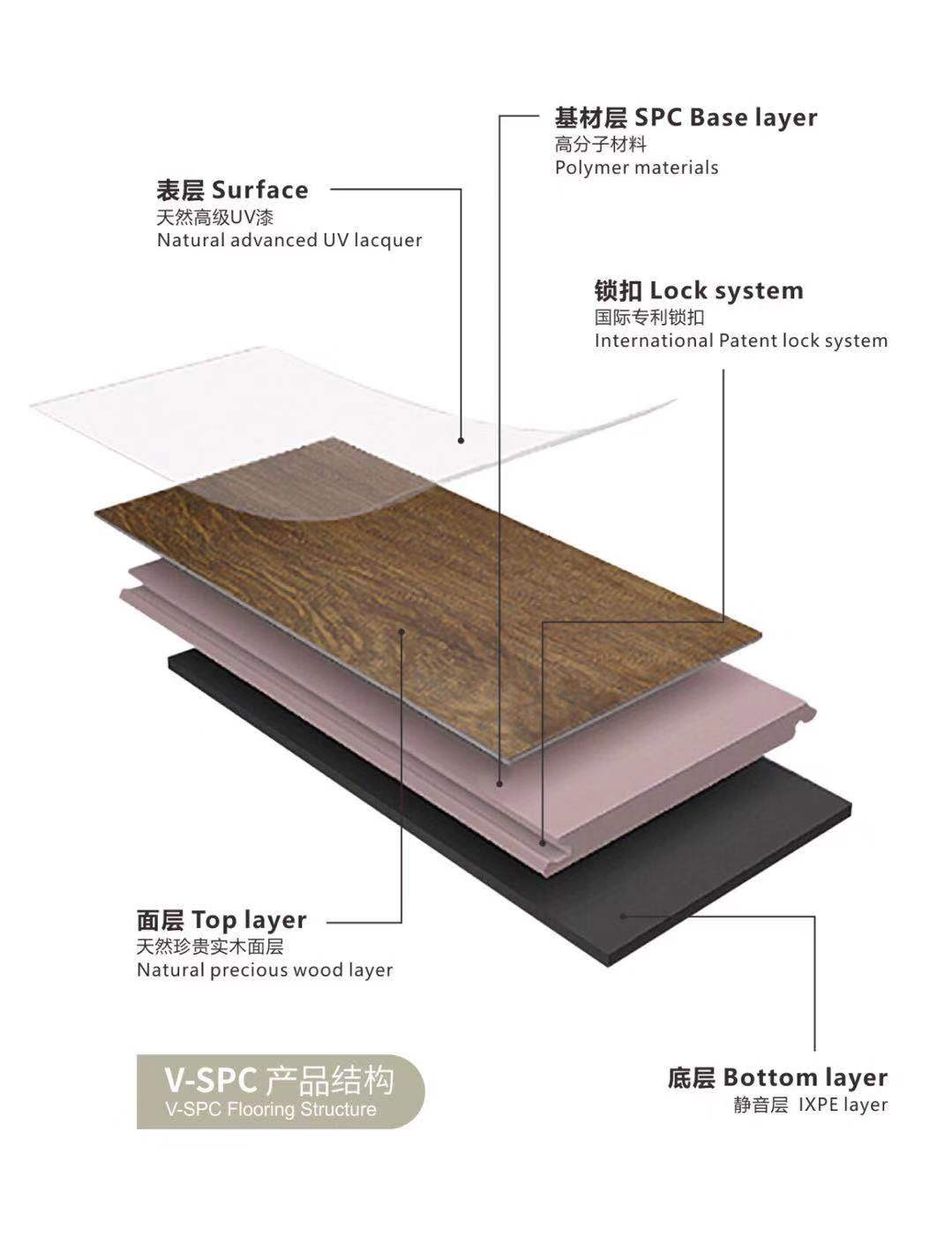 | The V-SPC flooring is a new product developed on the basis of the SPC flooring. V-SPC flooring is on the base of SPC flooring to cover all kinds of wood veneer, using gluing technology and UV lacquered. The main raw materials of our V-SPC flooring contain magnesium, accounting for about 22.8%, and the color is natural red, while ordinary V-SPC flooring does not contain magnesium. |