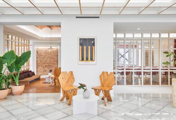 The LOOM offices in Plaza Catalunya, Barcelona, draw inspiration from the Noucentisme aesthetic, reinterpreting it through composition, color, texture, and materials. Geometric drawings on the surfaces frame natural wood floors, brick walls, and vaulted Catalan ceilings, guiding users through the space while celebrating the region's architectural heritage.
