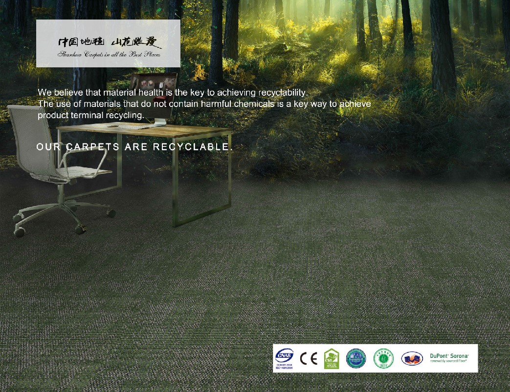 | PE backing carpet tile is new backing system of Silverstone carpet, the advanced characteristics are environmental protection, recyclability and recycling, good softness, light weight, convenient transportation and installation. Which is very suitable for commercial use. |