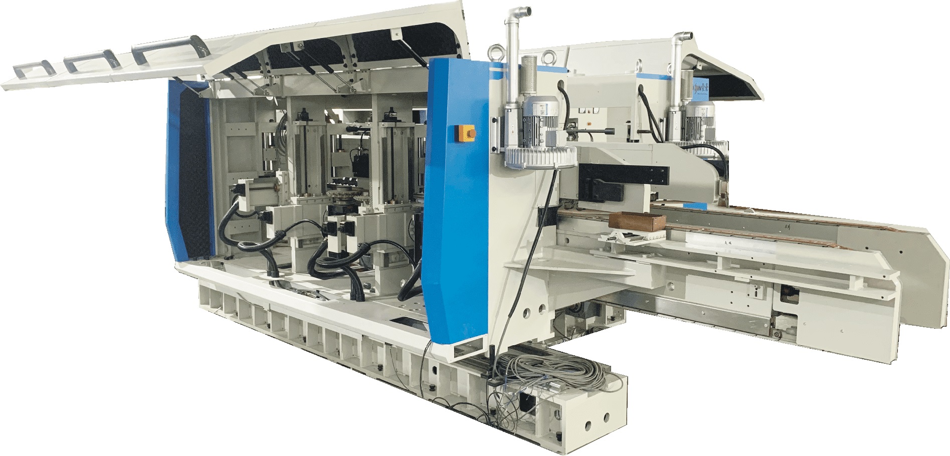 | Angle double end tenoner, through the double end tenoner principle of fishbone floor transverse end slotting. Can SPC floor, engineered floor, laminate floor and other materials for custom processing. |