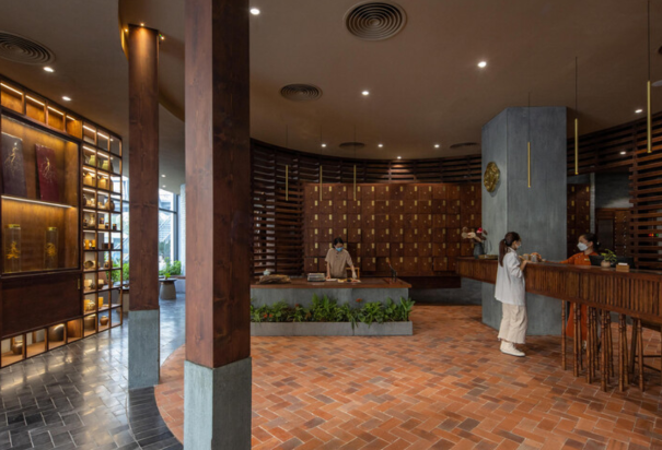 In a mixed-use residential complex in Hanoi, the Traditional Clinic integrates informative and educational pharmacy spaces with treatment areas. The design focuses on natural and traditional materials, with terracotta tiles and natural stone tiles forming an elegant curve on the floor. This combination not only delineates different functions but also reinforces the image of traditional medicine, fostering trust and understanding among patients.