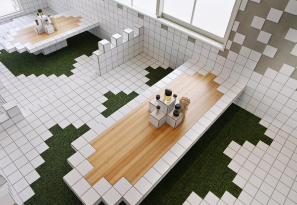 Inspired by early-format pixelated video games, this noodle bar features white ceramic tiles reminiscent of retro gaming aesthetics. The tiles extend from the floor to the walls and furniture, creating a cohesive visual experience. By strategically cutting away tiles in seating areas, the design directs patrons on where to sit, enhancing the immersive gaming-themed atmosphere.