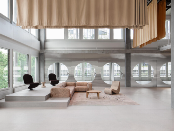 Designed as a mountain trail experience, the On Performance Running Footwear building features different "neighborhoods" representing various stages of a mountain path. Each floor offers a unique theme, with earthy tones, topographic maps, forest and lake inspirations, and a sky-themed library, creating a dynamic journey reminiscent of ascending a mountain.