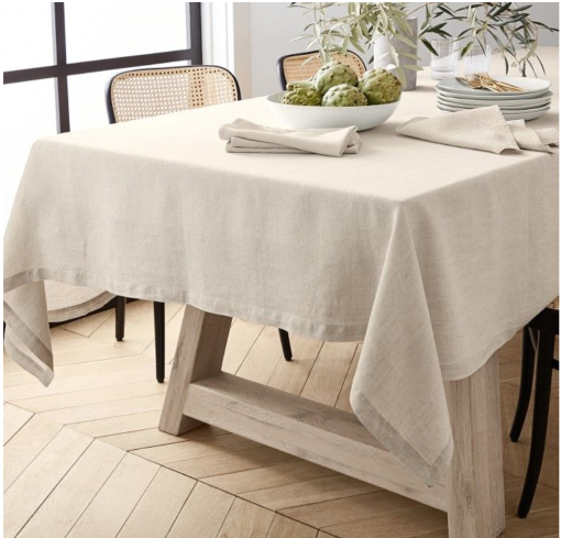 If you prefer a cleaner look without dramatic overhang, Williams Sonoma offers a tablecloth worth considering. The bordered edge adds an elegant touch, showcasing meticulous attention to detail.